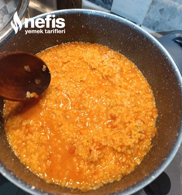 5. Son olarak sıcak suyu ekleyip, karıştıralım (yarım yemek kaşığı tereyağı ekleyelim) ve evvel yüksek sonra, kısık ateşte pişmeye bırakalım.