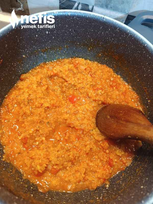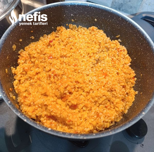 4. Birlikte 6/7 dk kadar kavurduktan sonra yıkanmış bulgurumuzu ekleyip tekrar karıştıralım.