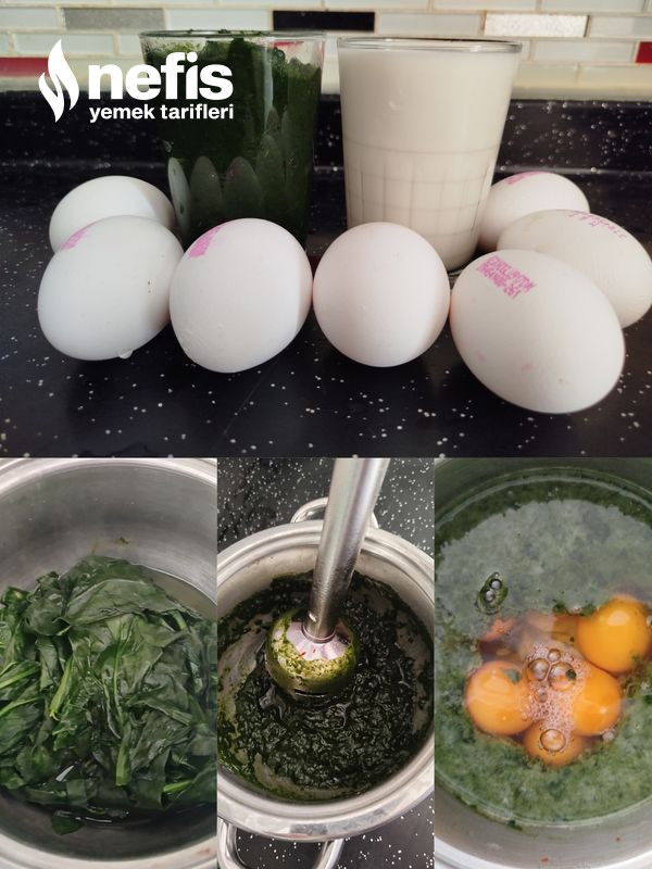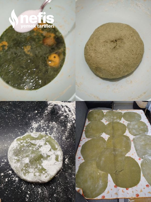 - Süt, yumurta ıspanak püresi,tuz karıştırın denetimli bir halde unu ekleyin sert bir hamur elde edin 10 dk dinlendirin.