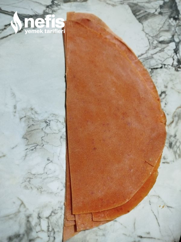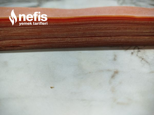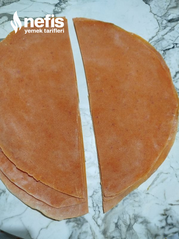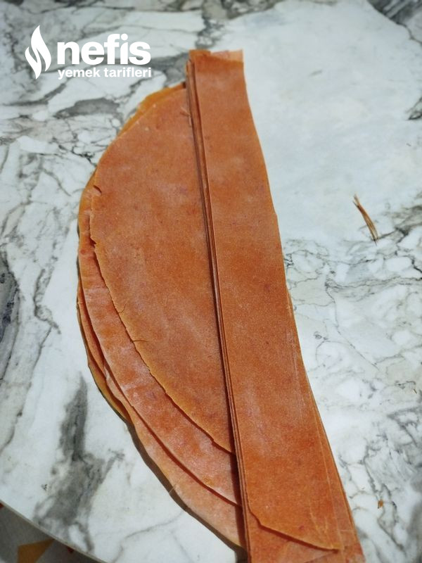 - Kuruyan yufkayı üst üste koyalım ortasından ikiye kesin 2 parmak genişliğinde erişteleri keselim.