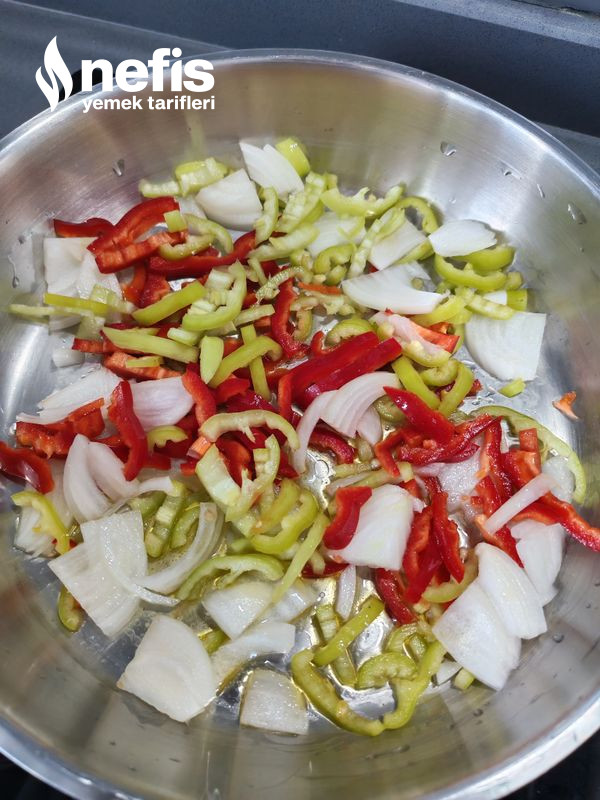 1. Öncelikle soğanı ve biberleri doğrayıp tavada kavuruyoruz.