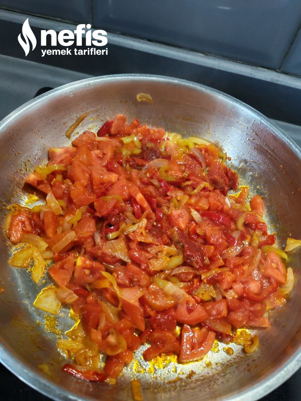 2. Biraz kavrulduktan sonra üzerine salça ve domates ekleyip pişiriyoruz.