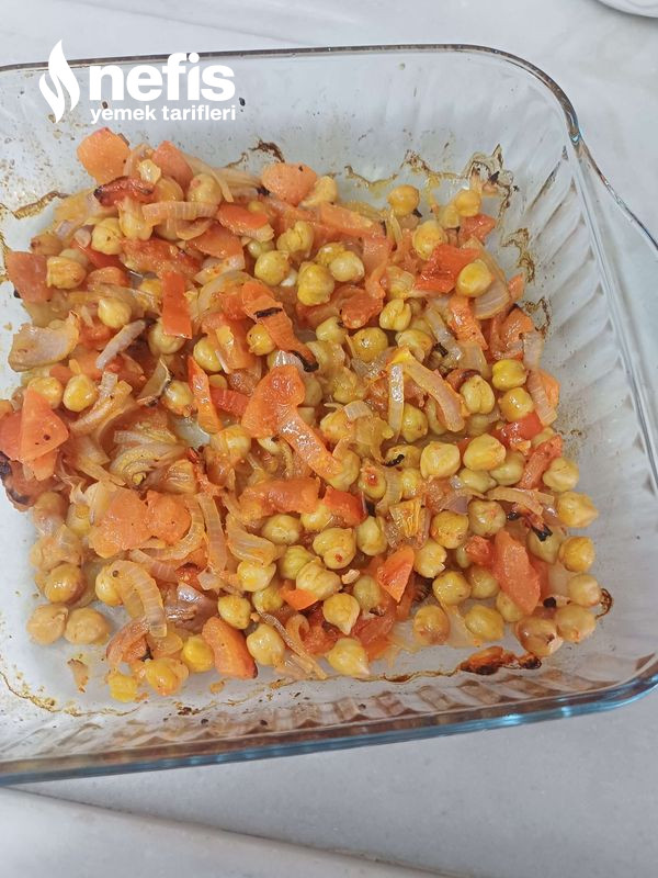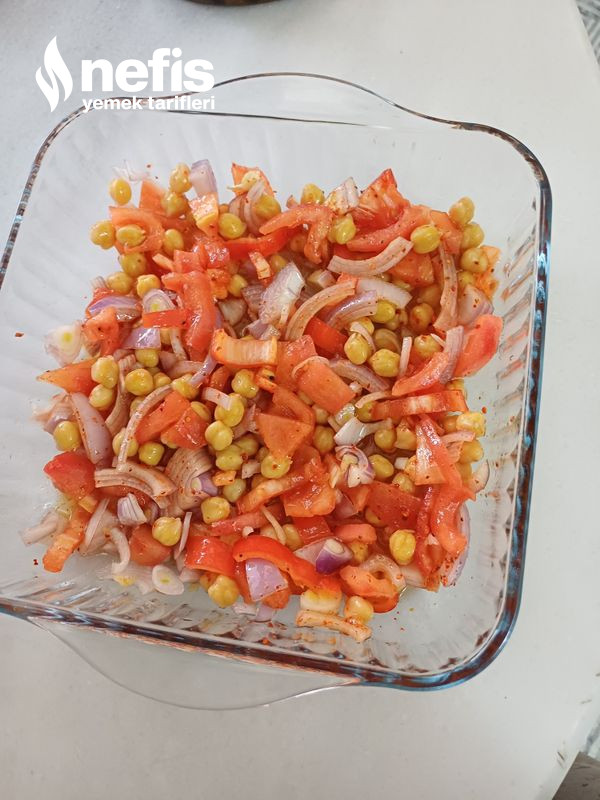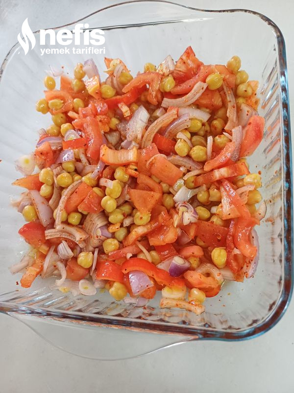 - Bir kase haşlanmış nohudumuzu tepsimize koyuyoruz üzerine domates biber ve soğanları iri olacak formda doğruyoruz.