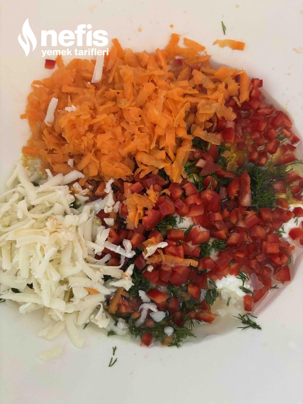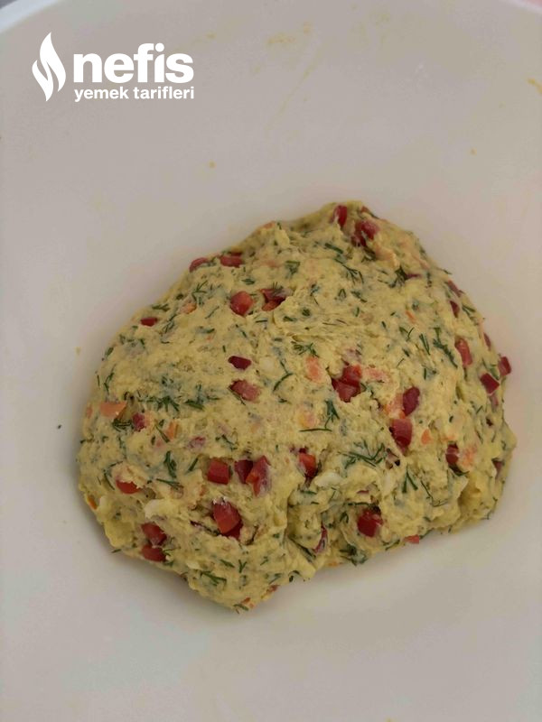- Daha sonra küp küp doğradığımız kapya biberi ,rendelediğimiz kaşar peynirimizi ve havucumuzu dere otunu ekleyip tekrar karıştıralım ve denetimli bir formda unumuzu ekleyip ele yapışmayan bir hamur elde edelim.