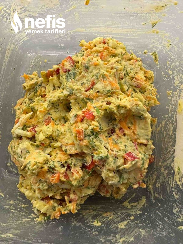 - Üzerine ince doğranmış dereotu, kapya biber, rendelenmiş havuç ve kaşar peynirini ekleyelim.