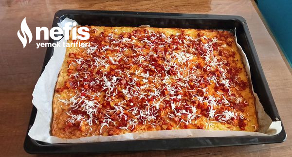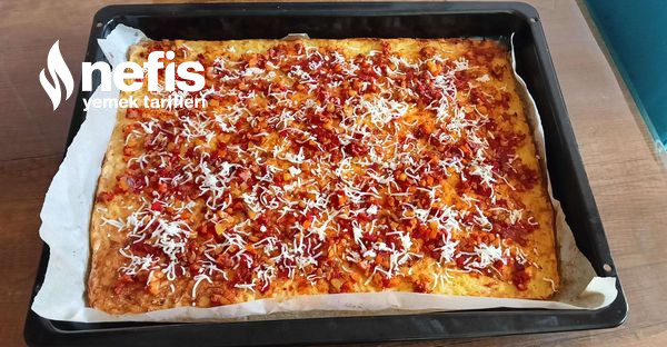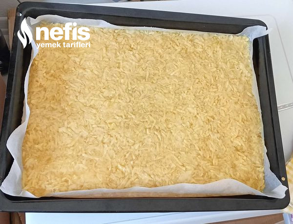 - Kare fırın tepsisine yağlı kağıdı serip içine yaptığımız patates harcını yayalım.