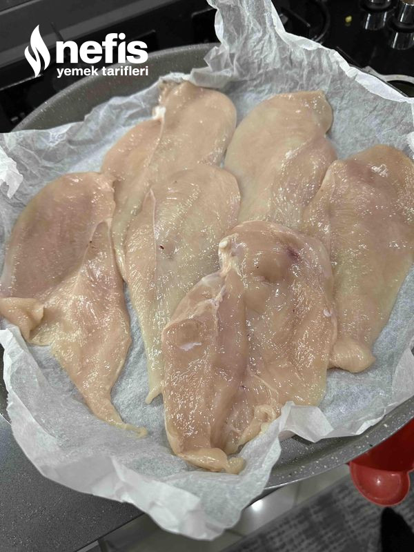 - 4 adet tavuk göğüsü (her birini 3’ e bölünmüş) fırın kağıdı serdiğiniz tepsiye yerleştirin.