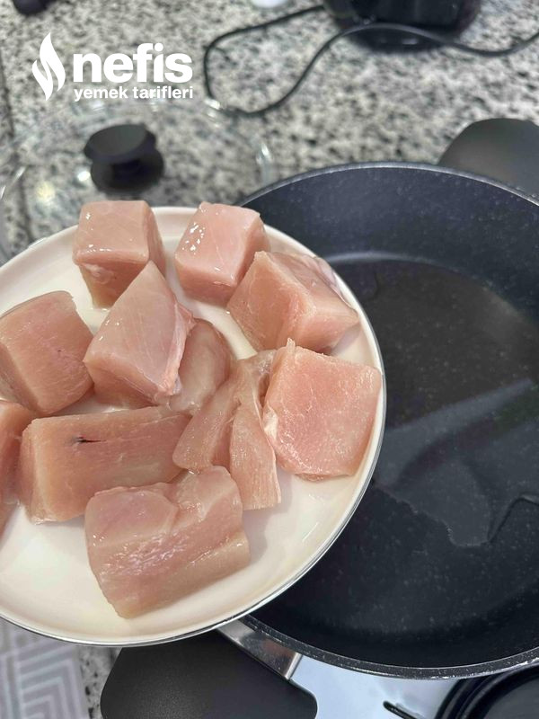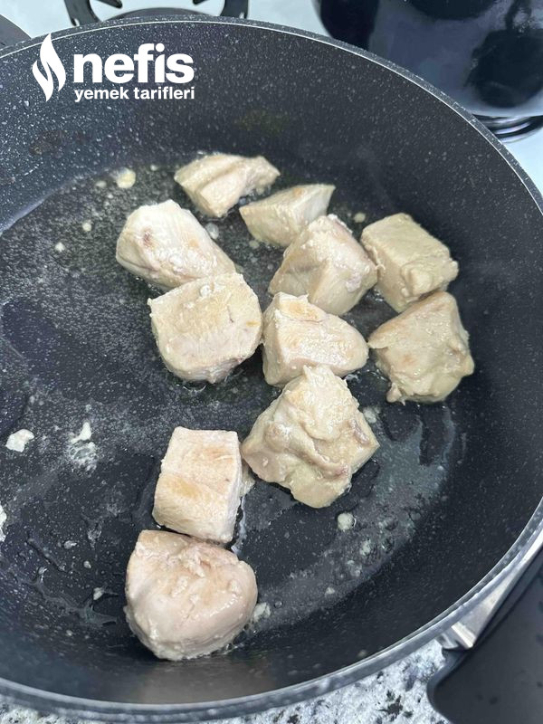 - Tencereye sıvı yağı ekleyip dilimlediğimiz tavuk göğüslerini(siz isterseniz tavuk budu, yada bütün tavuk kullanabilirsiniz) ekleyin ve tavuklar suyunu verip çekinceye kadar pişirin. Pembeleşen tavukları bir tabağa alıp kenara ayırın.
