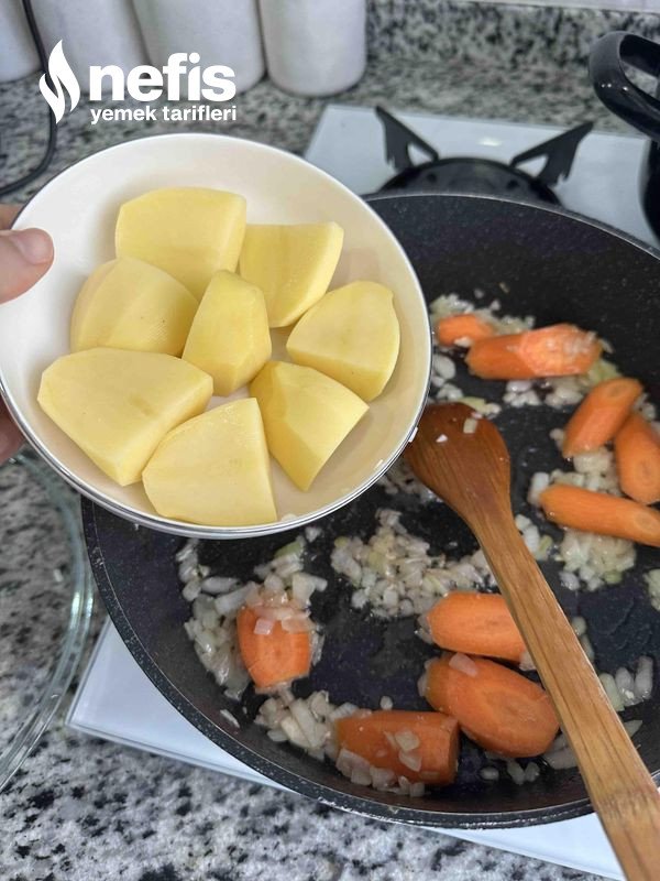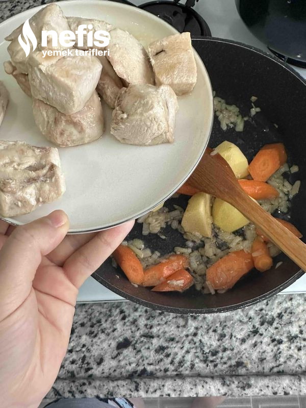 - Ardından havuçları ekleyin ve patatesleri ekleyin biraz kavurun. Tavukları da ekleyin.