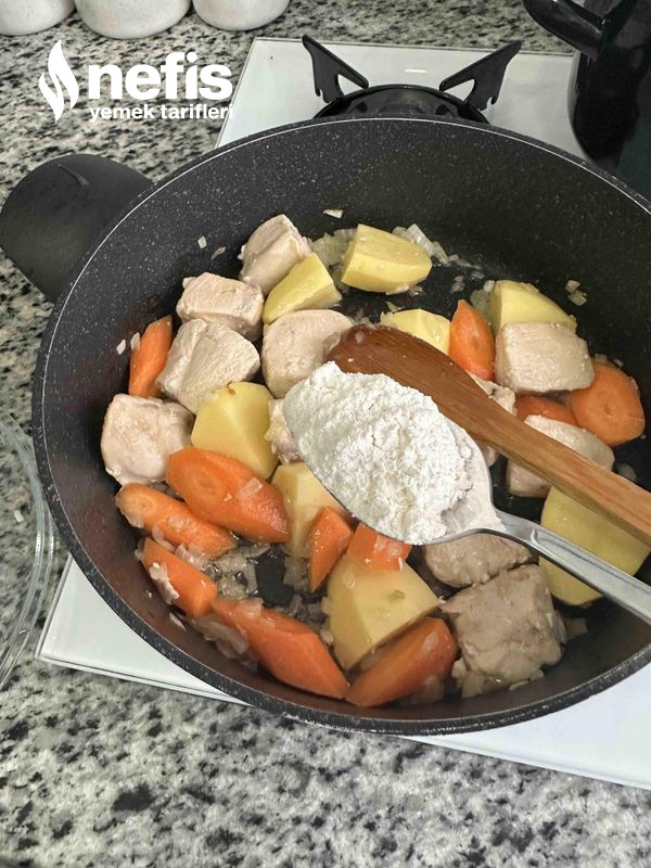 - 1 kaşık unu ekleyip biraz bu türlü kavurun.