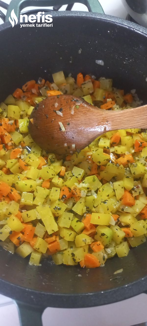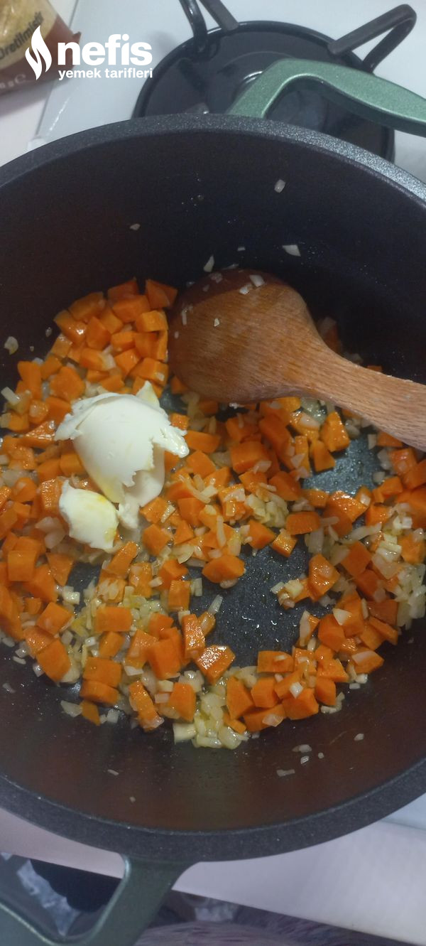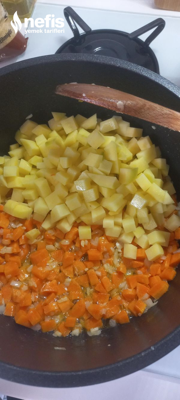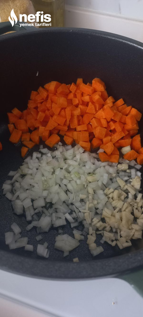 - Tencerede ince doğranmış soğan, sarımsak ve küp doğranmış havuçları az sıvı yağda kavuralım.