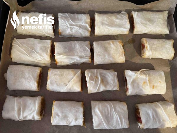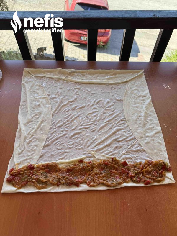 11. Yufkanın her yerine gelecek halde sosumuzdan sürelim, kenarına iç harcımızdan yerleştirerek yufkamızı çok sıkı olmayacak formda rulo yaparak saralım.