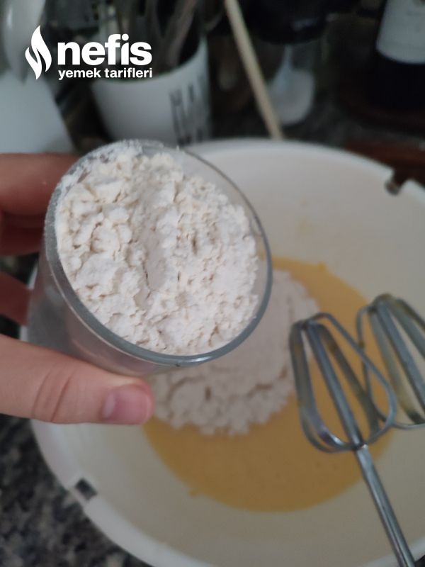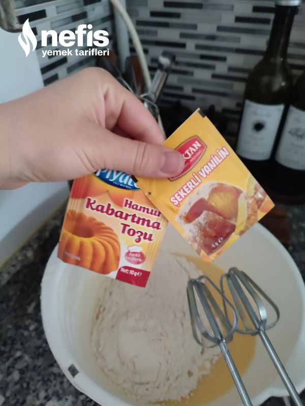 - Üzerine un, şekerli vanilin ve kabartma tozu ekleyip tekrar karıştıralım.