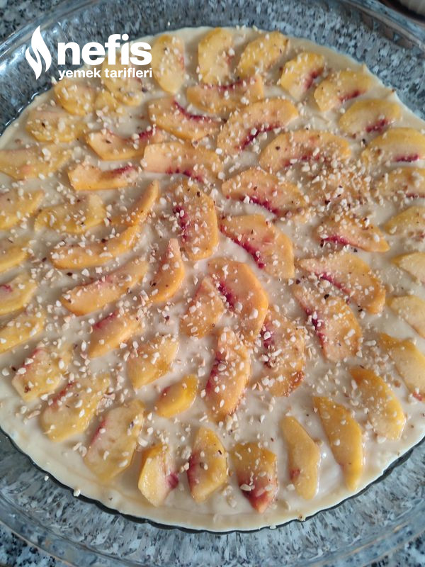 - Yuvarlak borcama dökelim üzerine şeftali dilimlerini dizelim ve fındık kırığı serpelim.