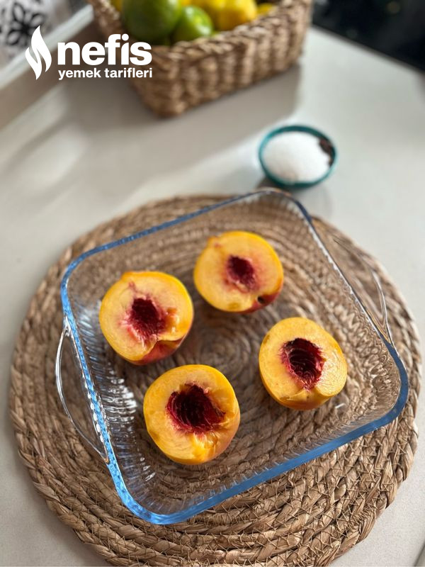- İki adet şeftali ortadan kesiyoruz, fırın kabına yerleştiriyoruz .