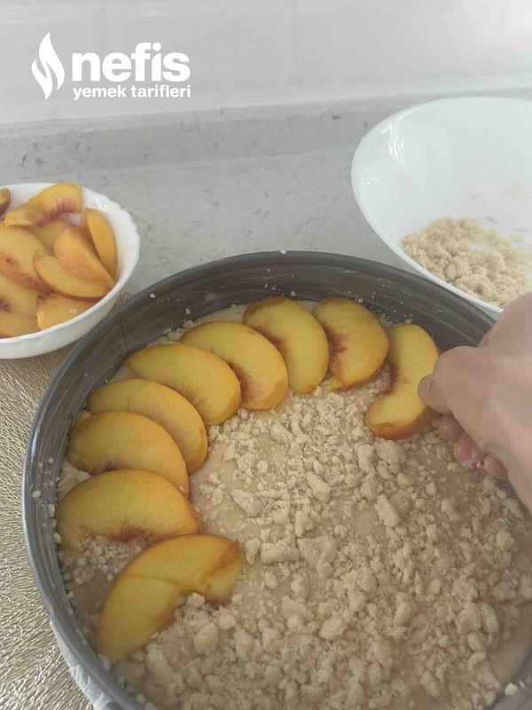 4. Ardından ince dilimler halinde kestiğimiz ikinci şeftalimizi kekimizin üzerine sıralayalım. Kalan kırıntılı hamuru üzerine serpelim.