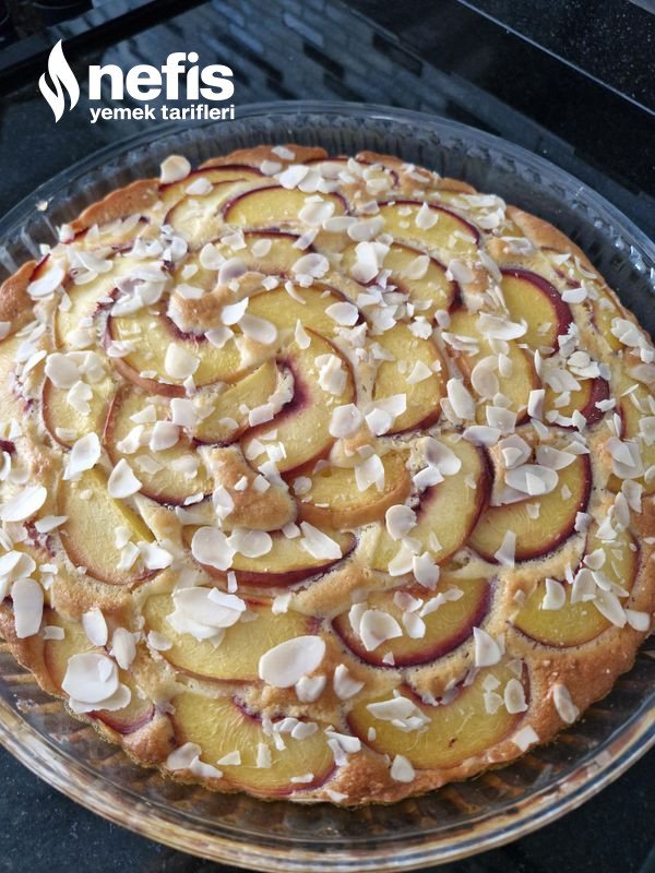 - Üzerine şeftalileri ince ince dilim ve yerleştirelim en üstüne file badem koyalım .