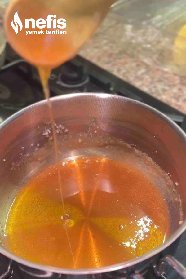 1. Sos tenceresine dört yemek kaşığı toz şekeri kısık ateşte eriyinceye bırakıyoruz kaynadıktan sonra yarım çay bardağından daha az suyu döküp karıştırıyoruz.