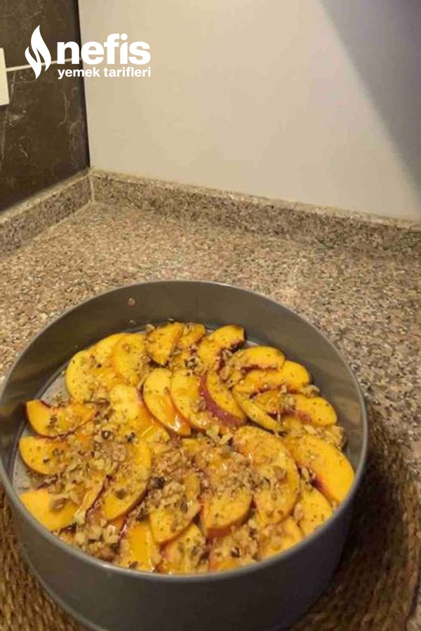 4. Şeftalilerin üzerine cevizleri serpiyor ve kek harcını döküyoruz.