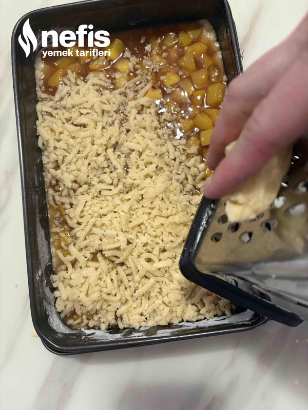 - Hamuru 2 eşit kesime ayırınız borcamın içine güzelce elinizle bastıra bastırara yerleştiriniz üzerine şeftali dolgusunu dökünüz kalan hamuru şeftalilerini üzerine rendeleyiniz.