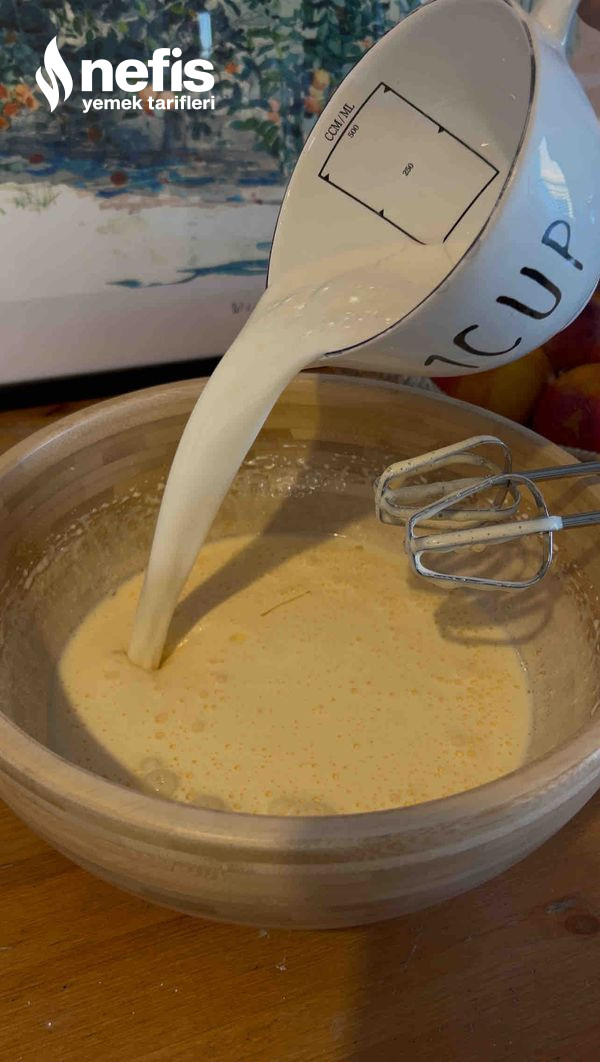 - Yumurta ve şekeri bembeyaz olana kadar çırpıyoruz. Akabinde süt ve sıvı yağı ekleyip tekrar çırpıyoruz. Son olarak şekerli vanilin, kabartma tozu ve unu da ekleyip süratlice karışım homojen bir hal alana kadar çırpıyoruz.