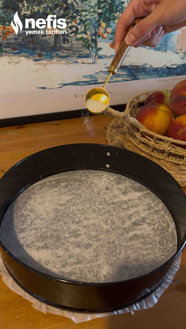 - Kalıbımızın altına bir pişirme kağıdı serip tabanı kaplayacak kadar toz şeker serpiyoruz. Üzerine dilimlediğimiz şeftalileri dizip kek karışımını üzerine döküyoruz.