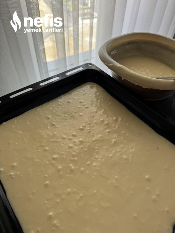 - Hamurun yarısını yağladığınız tepsiye dökün.
