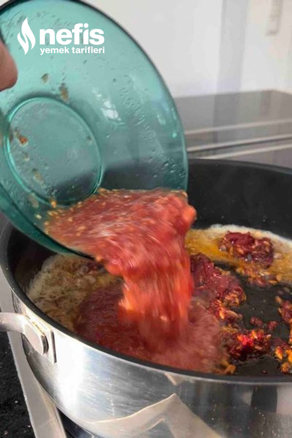 - Biber ve domates salçasını ekleyip karıştırın, akabinde rendelenmiş domatesleri ek edin ve tekrar karıştırın.