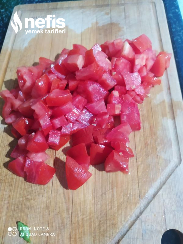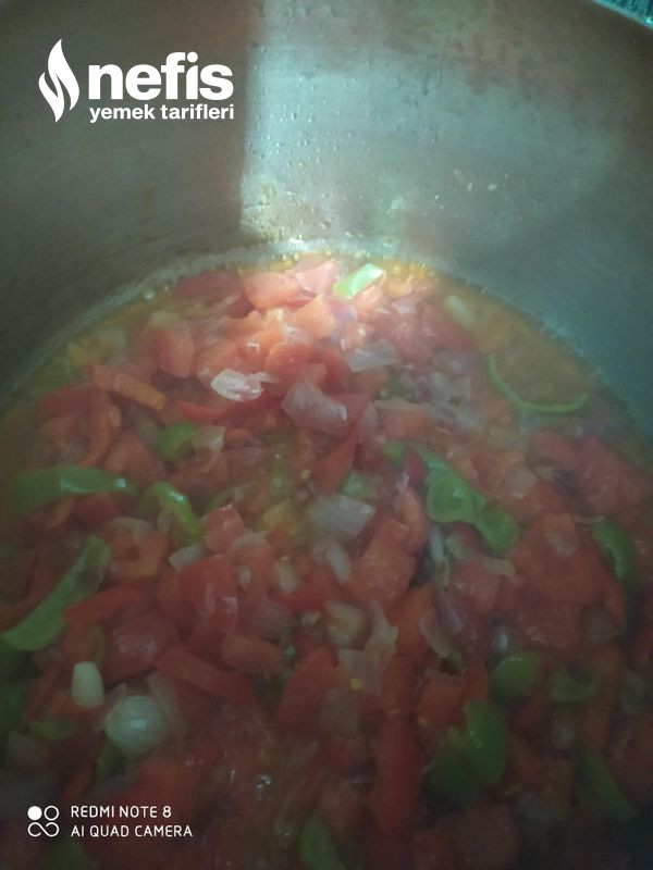 - Daha sonra domatesler koyup kavuralım ve tiftiklediğimiz eti içine ekleyelim.