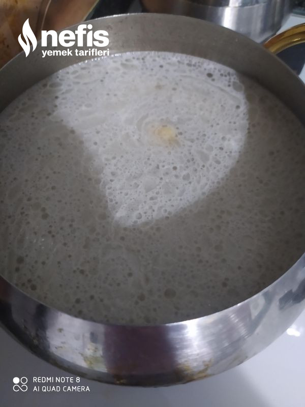 - Haşladığımız tavuk suyunu içine ekleyelim.