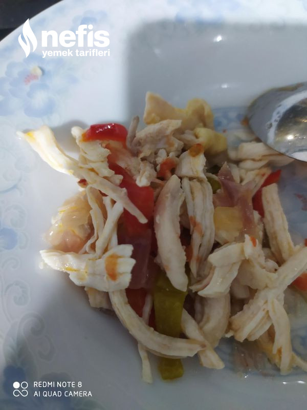 - Haşladığımız tavuk göğsünü çıkaralım ve tiftikleyelim.