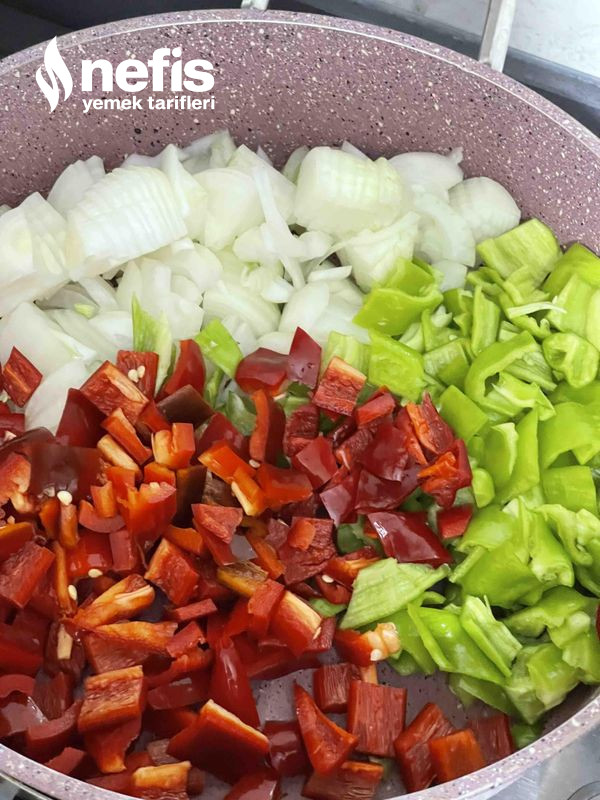 4. Geniş bir tavaya sıvı yağ alalım küp küp doğradığımız kapya biber,yeşil biber,soğan ve sarımsağı kavuralım.