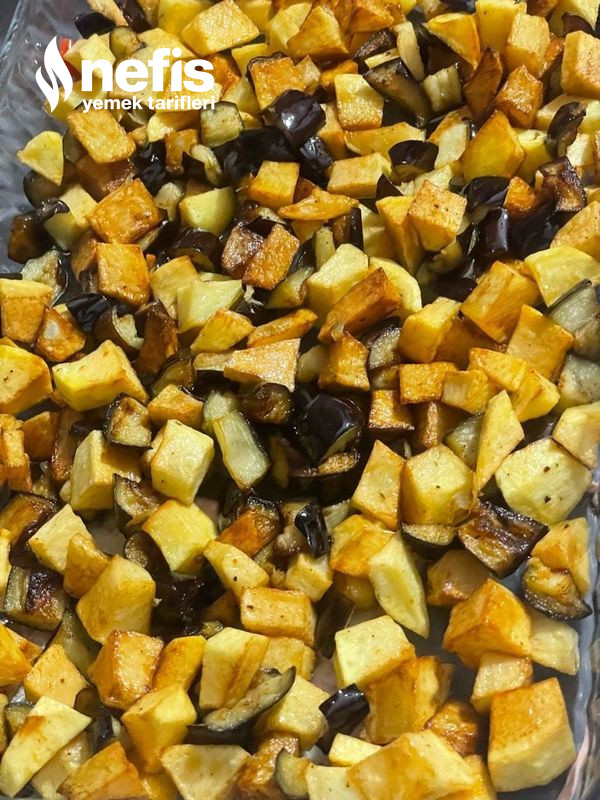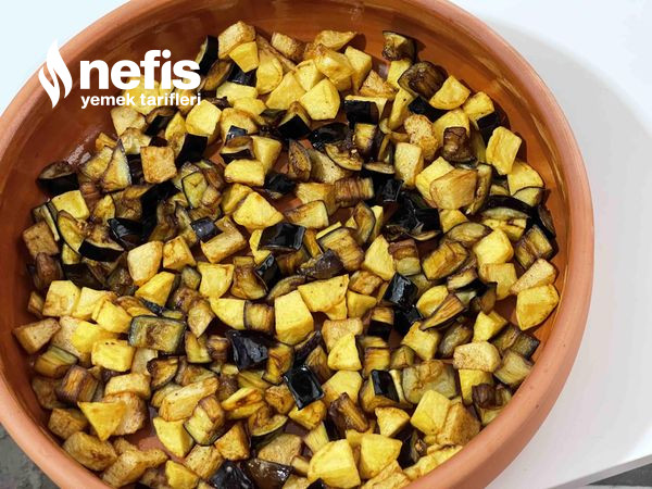 3. Patlıcan ve patatesleri iri küpler halinde doğrayıp kızartalım, havlu kağıt üzerine alalım ,yağını süzsün.