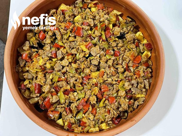 6. Etimiz piştikten sonra süzüp sebzelerin üzerine ekleyip güzelce karıştıralım.