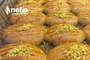 4. Üzerine yumurta sarısı ve çatal yardımı ile biçim veriyoruz 180 derece fırında üzeri kızarıncaya kadar pişiriyoruz birinci sıcağı çıkınca şerbeti üzerine döküp 2-3 saat dinlendiriyoruz.
