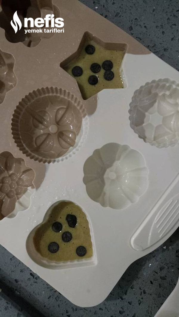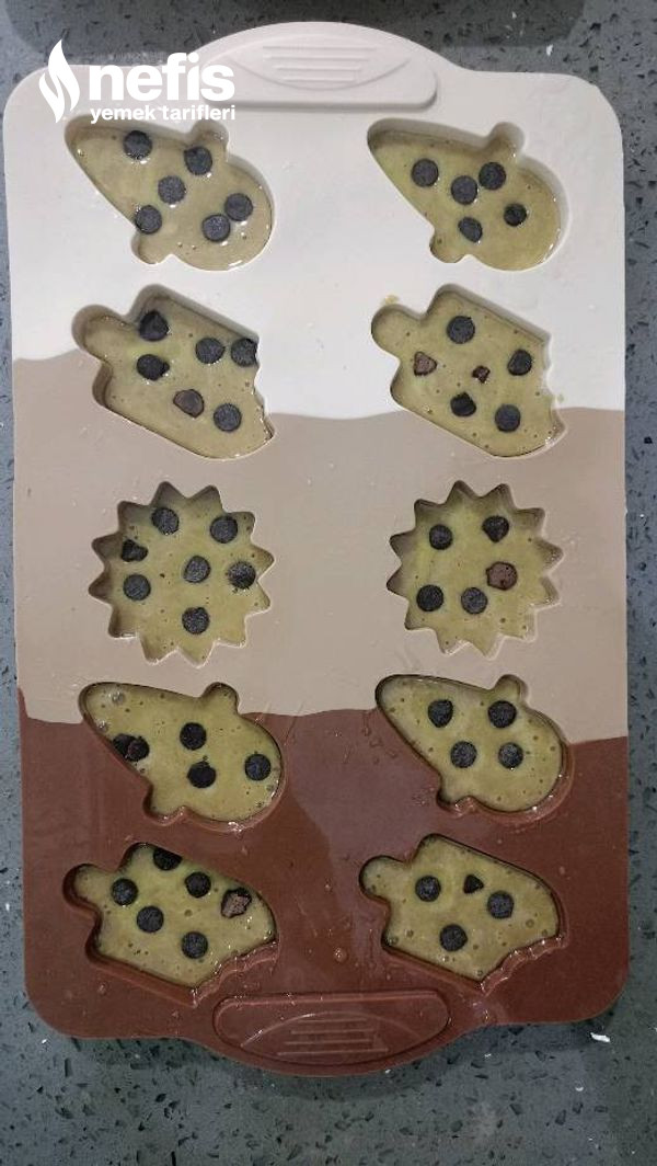 2. Önceden ısınmış 170 derece fırına yağlanmış silikon kalıplara döküp çikolata damlaları serpiştirelim ve fırında 20dk denetimli pişirelim. Çok hoş oluyor varsa silikon kapılarınız kesinlikle deneyin çocuklar çok seviyor beslenme ye orta öğüne yapın fotoğraf ve yorumlarınızı bekliyorum🤲🤭.