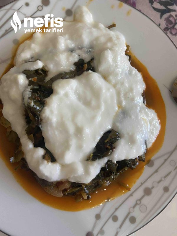 7. Pişen semiz otlarımızı servis tabağına alıyoruz ve üzerine yoğurt dökerek servis ediyoruz.