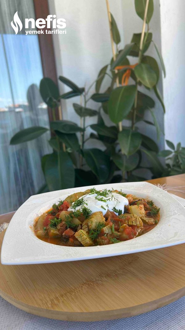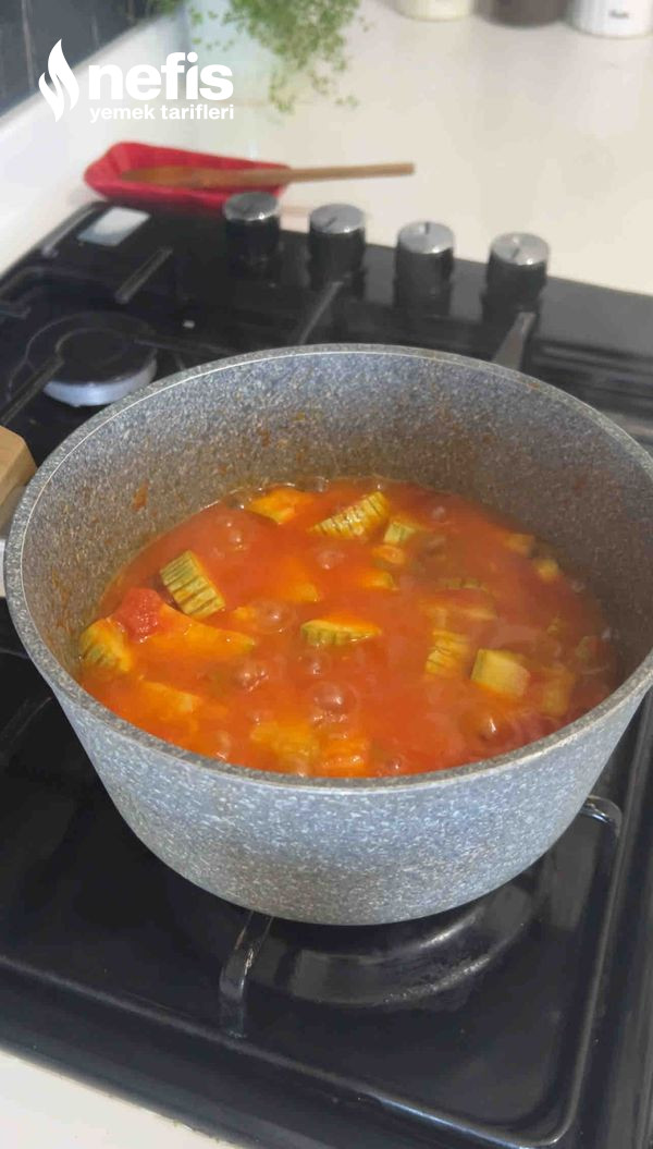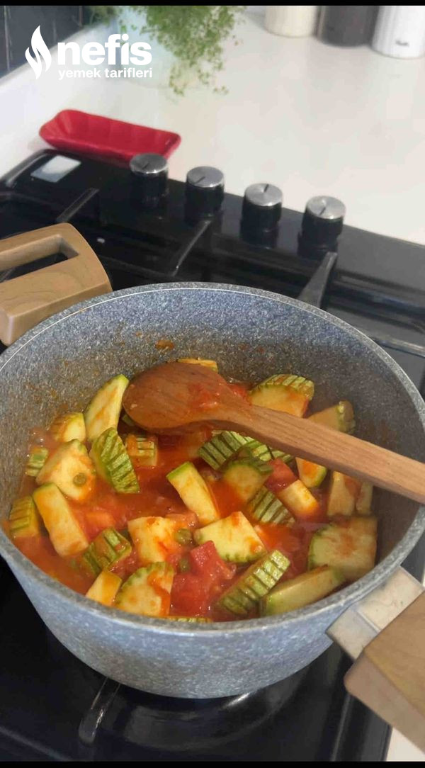 - Kabaklarıda ekledikten sonra tuzunu damak tadımıza nazaran ayarlayıp yarım çay bardağı kadar su ek ediyoruz (domatesleriniz sulu değilse duruma nazaran suyu artırabilirsiniz)