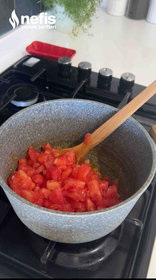 - Kavrulan biberlere salçayı ekledikten sonra kabuğunu soyup, küçük küçük doğradığımız domatesleride ekliyoruz.