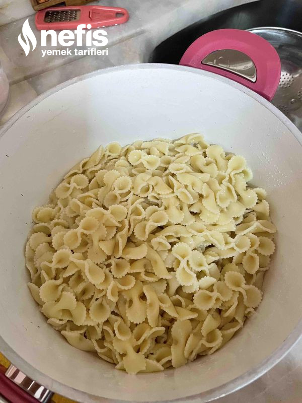 2. Makarnayı haşlayıp süzün soğutmak için suya tutabilirsiniz ya da vaktiniz varsa bir kaşık sıvı yağla karıştırıp kendi kendine soğumasını bekleyebilirsiniz.