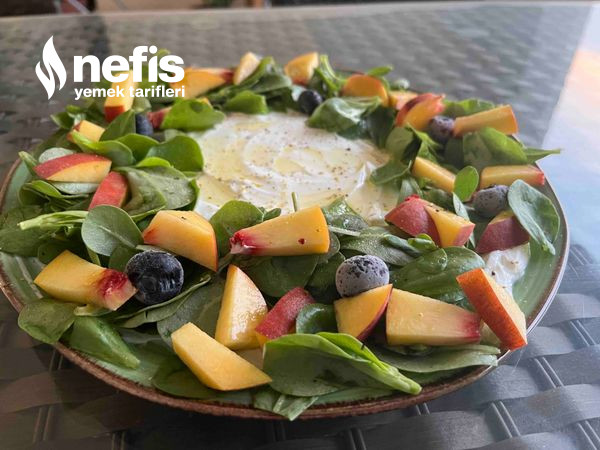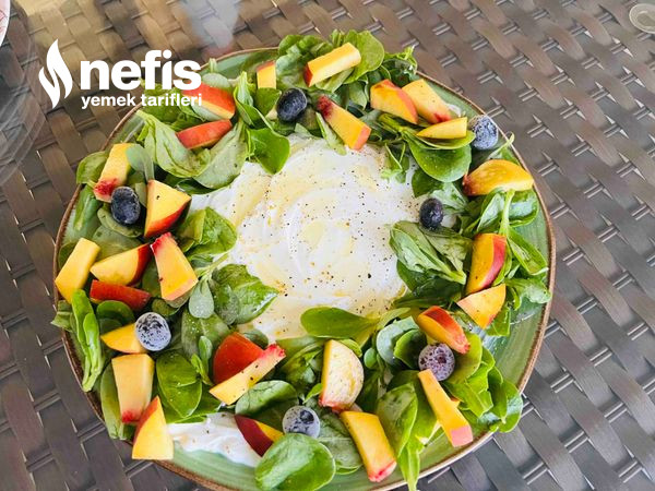 3. Şeftaliler küp küp doğranıp salata eklenir üzerine tuz dökülür bir avuç yaban mersini salata eklenir üzerine zeytinyağ ile servis yapılır.