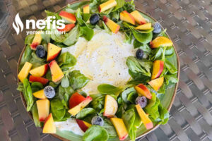 3. Şeftaliler küp küp doğranıp salata eklenir üzerine tuz dökülür bir avuç yaban mersini salata eklenir üzerine zeytinyağ ile servis yapılır.