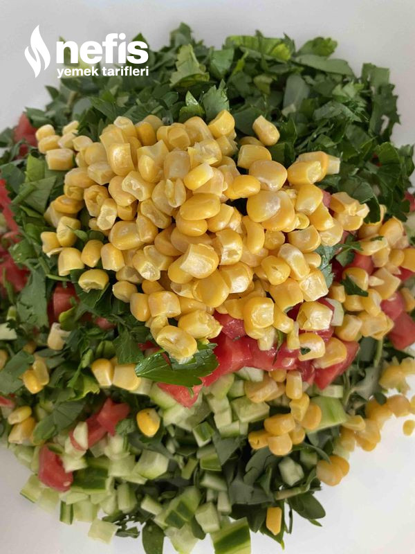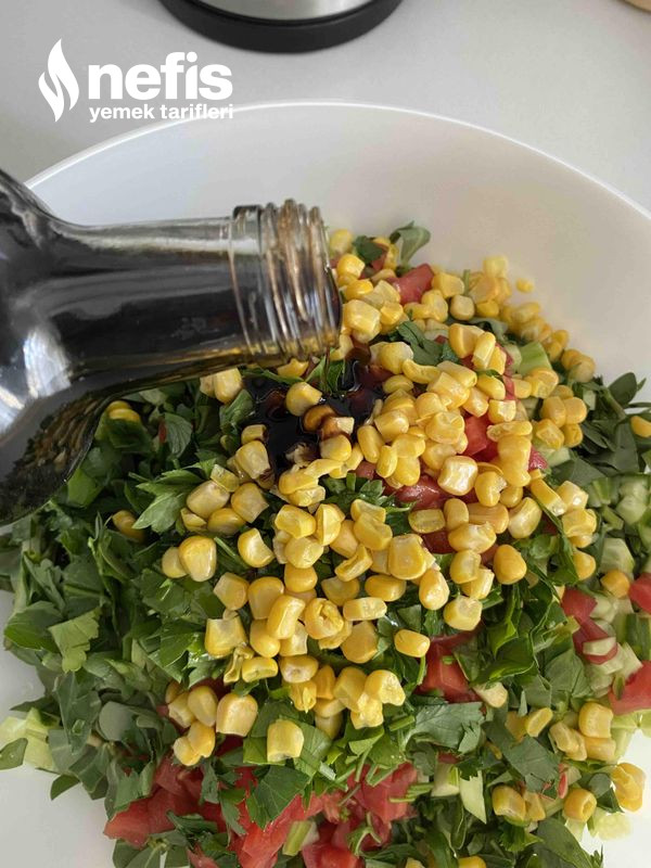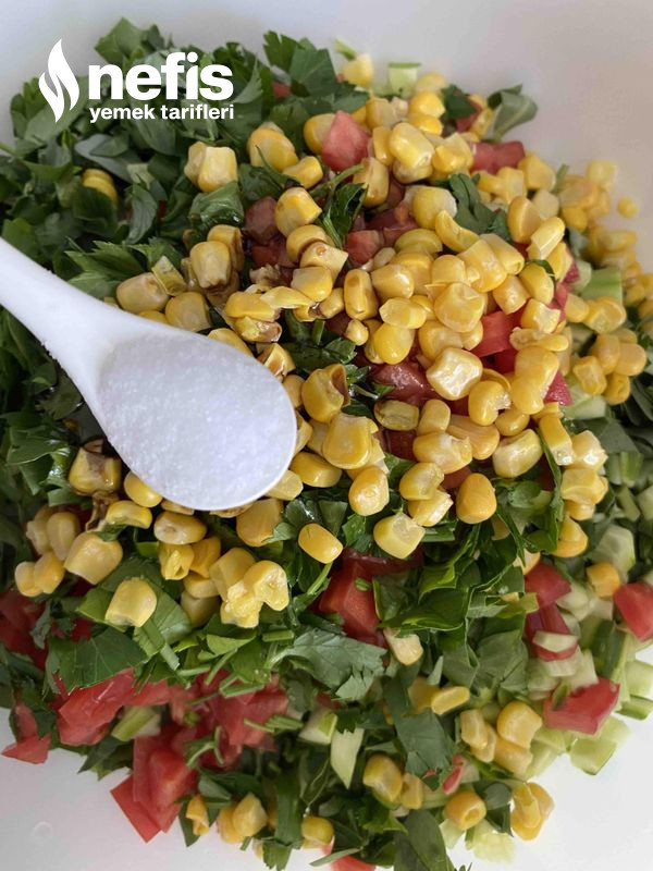 - Sonra üzerine mısır, limon, nar ekşilerini, zeytinyağının ,pul biberini tuzunu ekler kaşıkla karıştıralım. Servis edelim afiyet olsun. 😋.