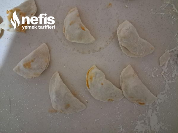 - Hamuru çok kalın olmayacak formda açalım. Kavanoz kapağıyla yuvarlak formlar elde edelim. Biçimlerin ortasına ülkü olacak kadar pirinçli içimizden koyup d biçimi verecek formda kapatalım. Çatalla kapadığımda kenarlara bastırarak iz verelim.