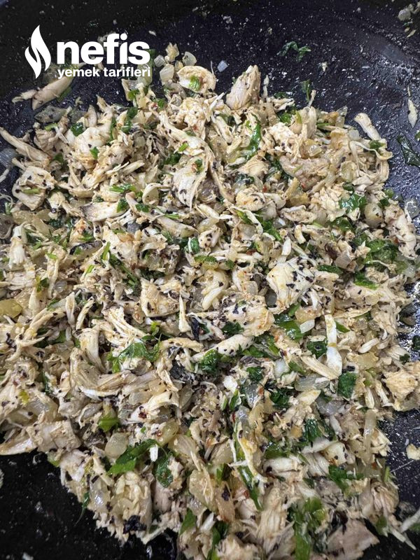 - Sonra didiklenmiş tavukları, baharatları, kuru reyhan ve maydanozu ekleyip karıştırıyoruz.