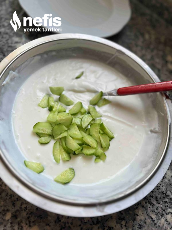 - Daha sonrasında yoğurdu su ile açalım, biraz içine sarımsak rendeleyip tuzunu koyalım.