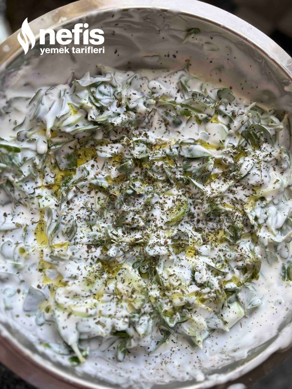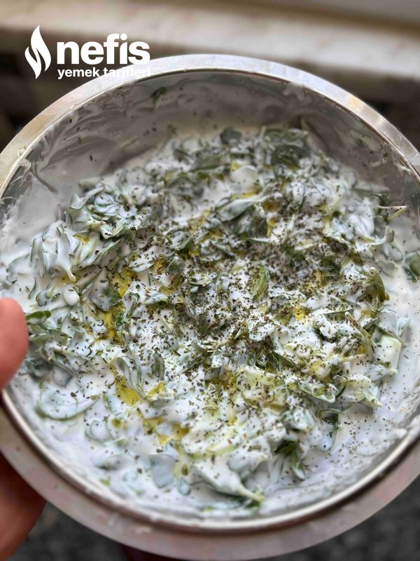 - Semizotlarını yıkayıp yoğurda koyalım üzerinde zeytinyağı gezdirip naneyi ekleyelim. Afiyet olsun🩷.