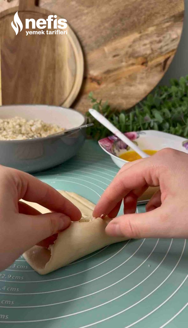 8. Peynirli kısmı sararken, kestiğiniz şeritleri üstüne gelecek biçimde sarın.