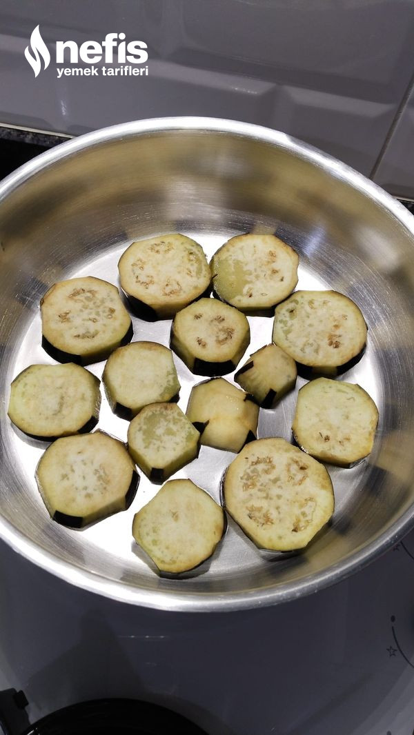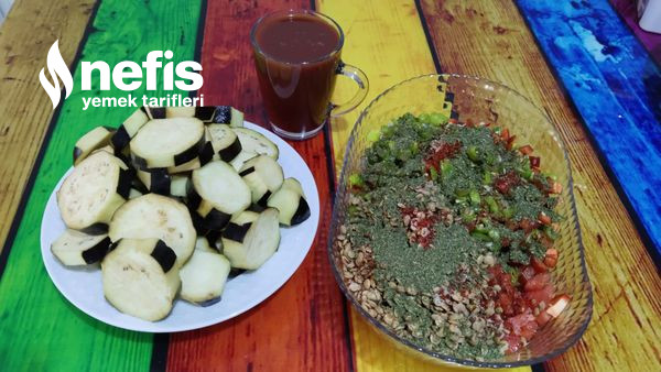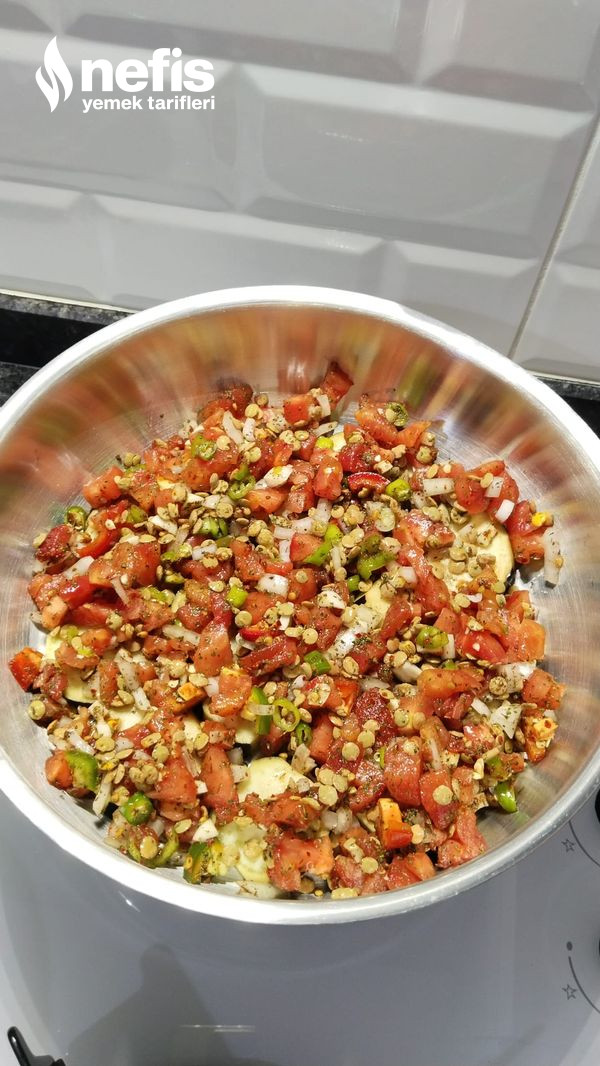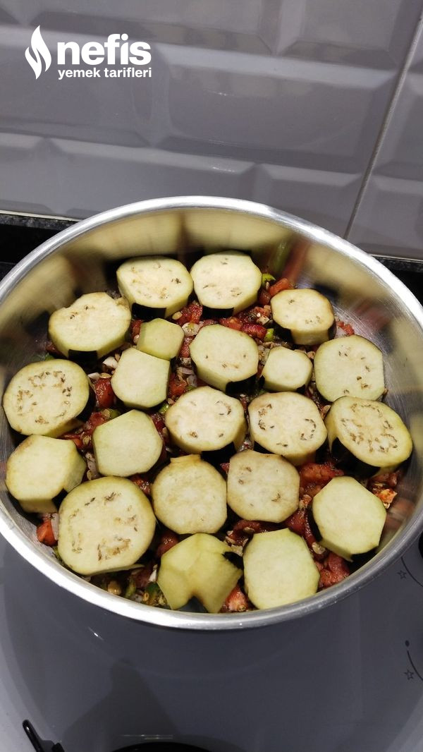 7. Kalan patlıcanları dizelim. En üste kalan domatesli biberli karışımı dökelim.