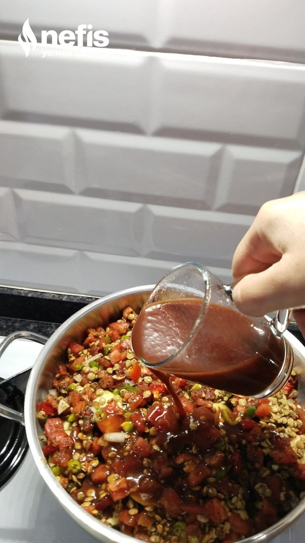 8. Sos için bir kupaya salça, su ve nar ekşisini alıp karıştıralım.